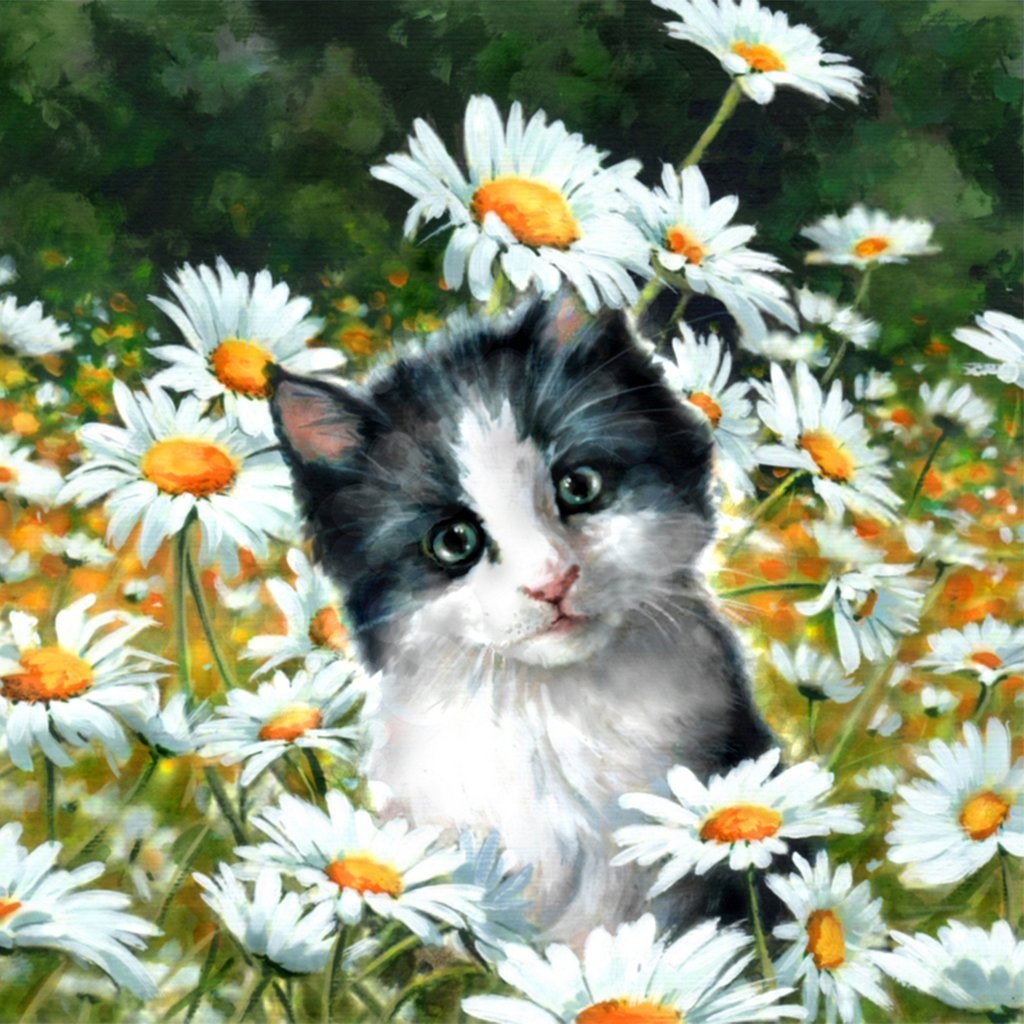 Chaton Noir et Blanc parmi les Pâquerettes Blanches Broderie Diamant