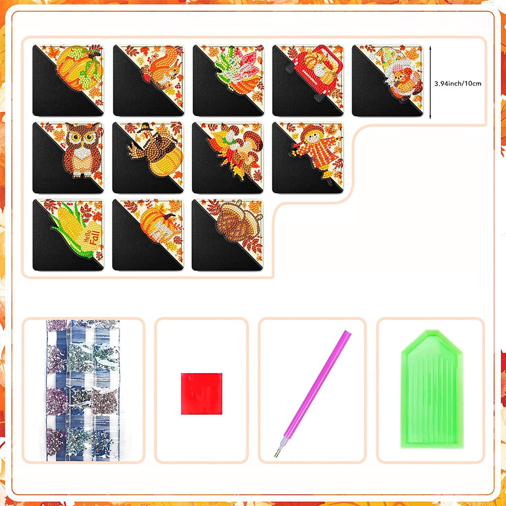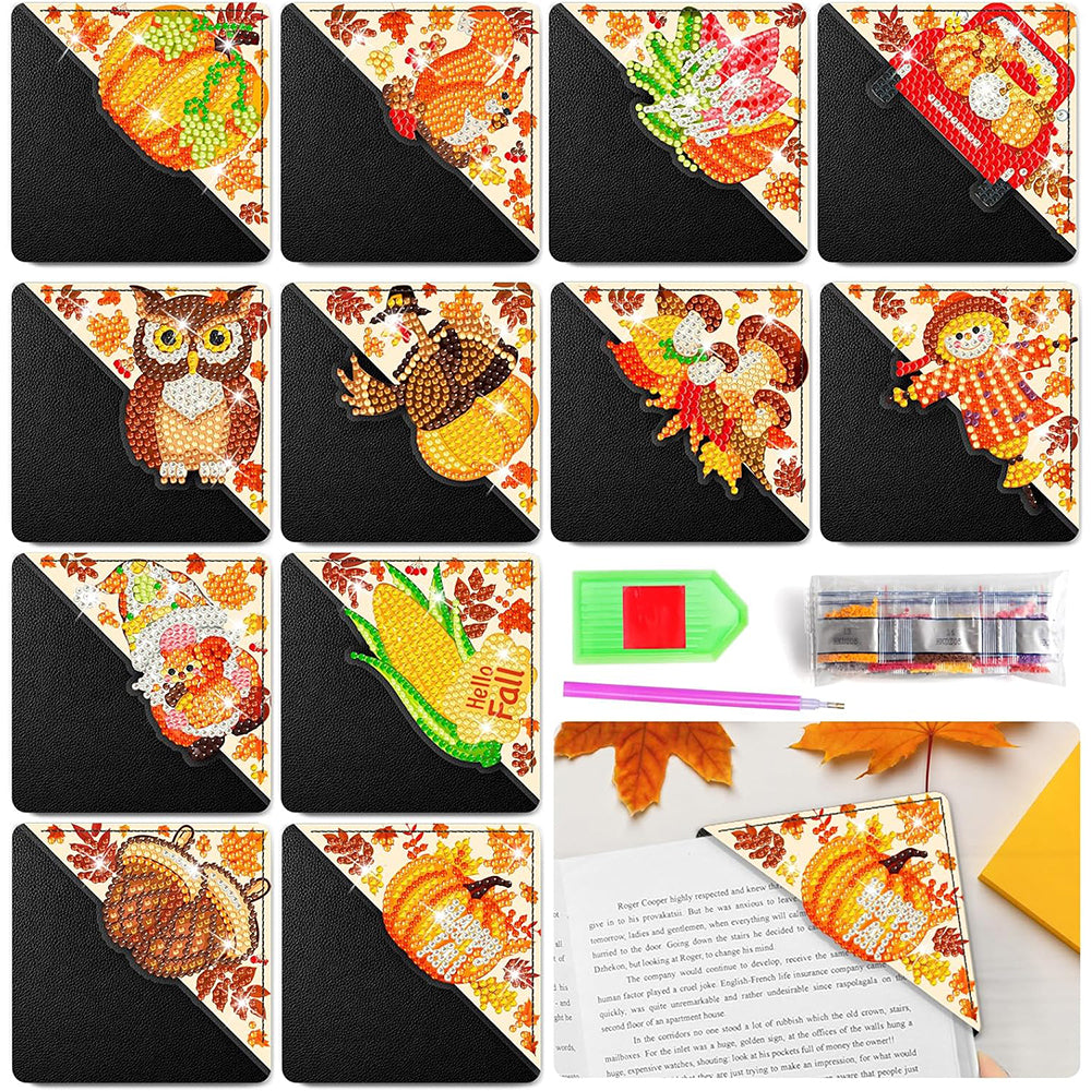 12Pcs de Marque-Pages Avec Coins Protecteurs en PU Bonjour Automne Broderie Diamant