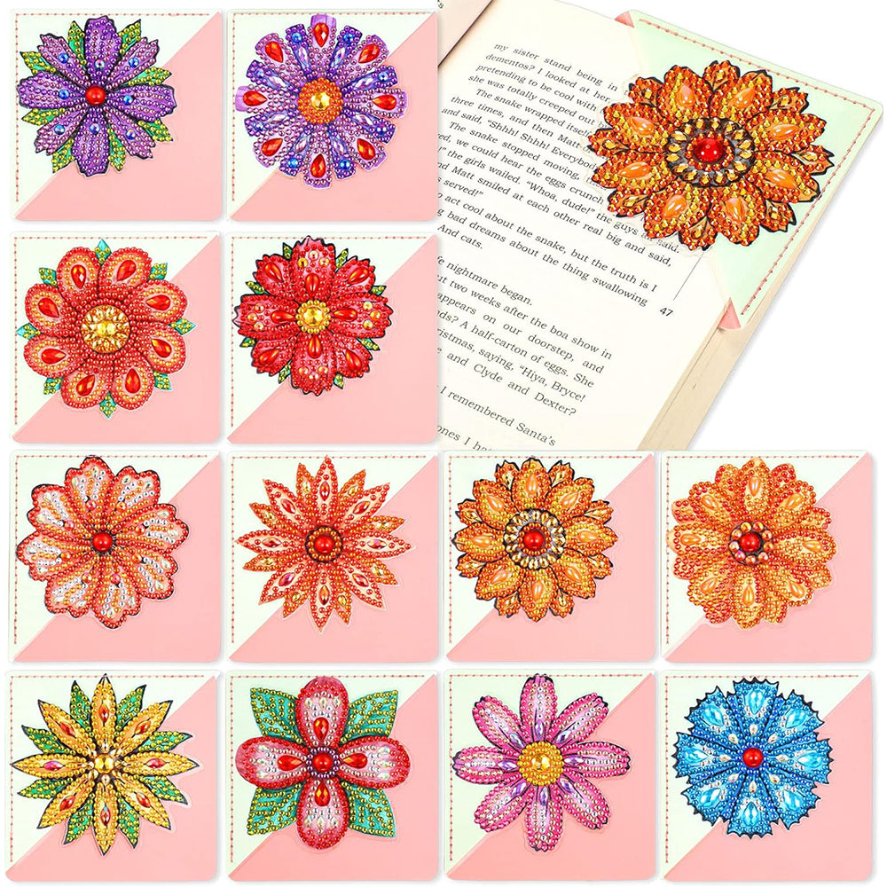 12Pcs de Marque-Pages Avec Coins Protecteurs en PU Chysanthème Divers Broderie Diamant