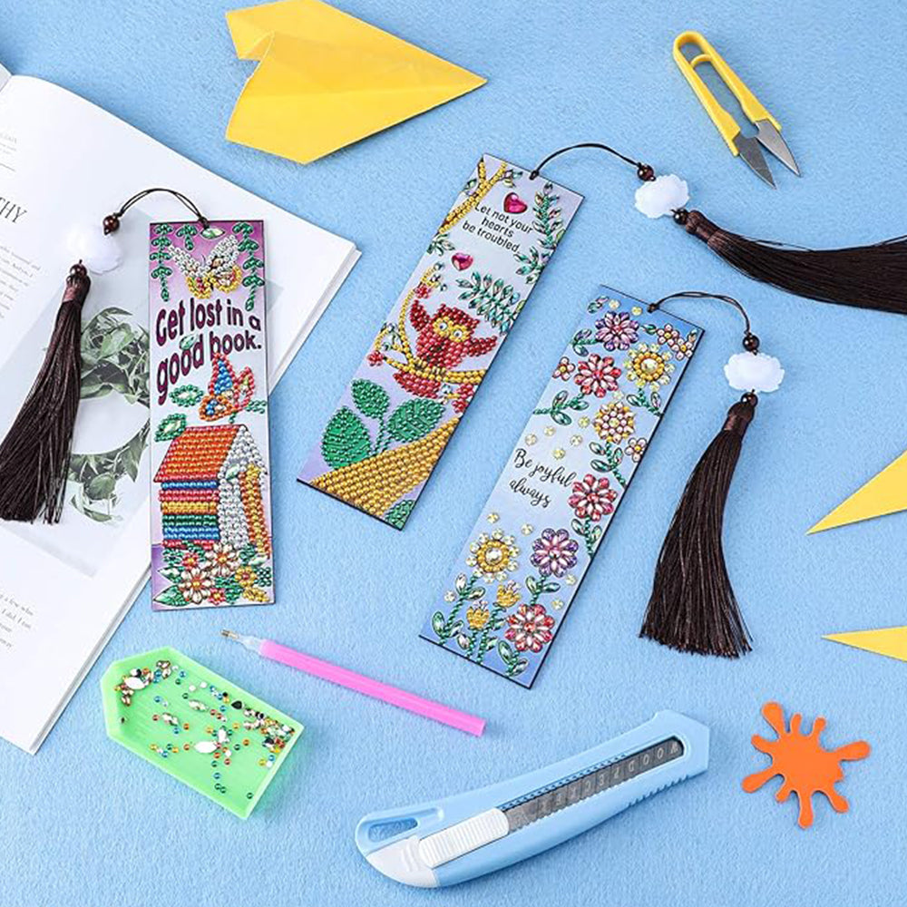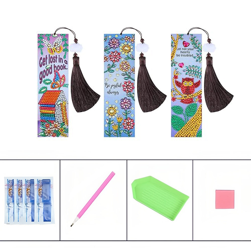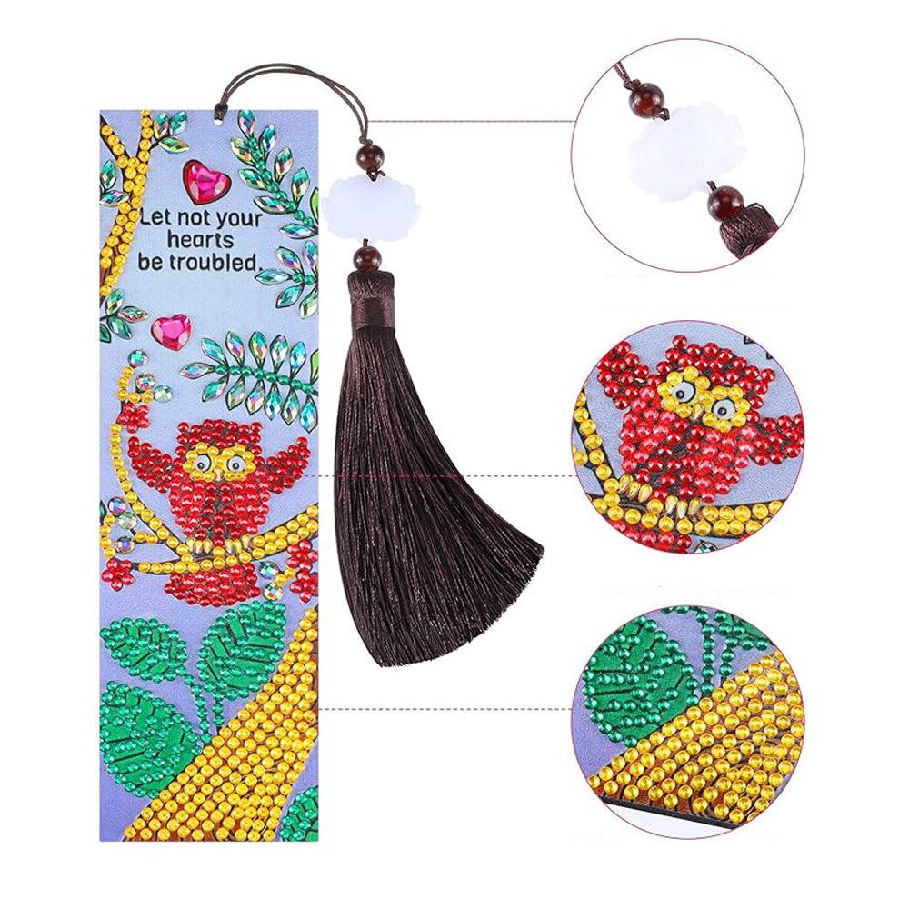 3Pcs de Marque-Pages en Cuir Hibou, Nid et Fleurs Broderie Diamant