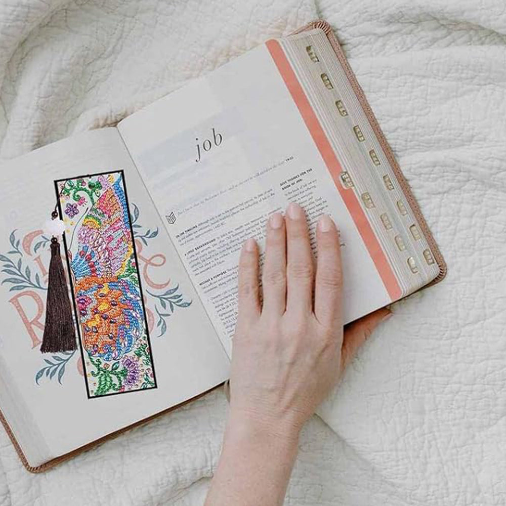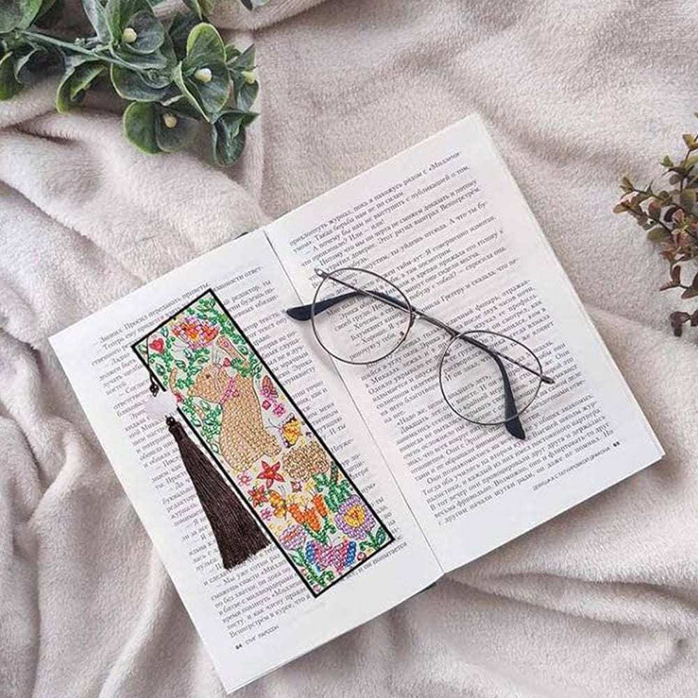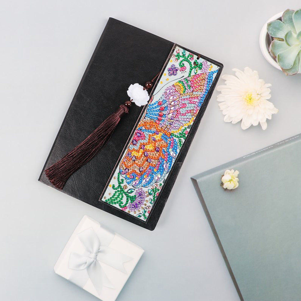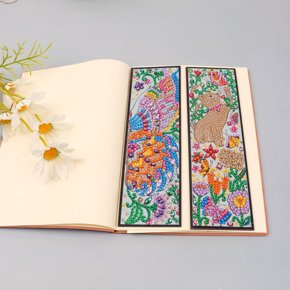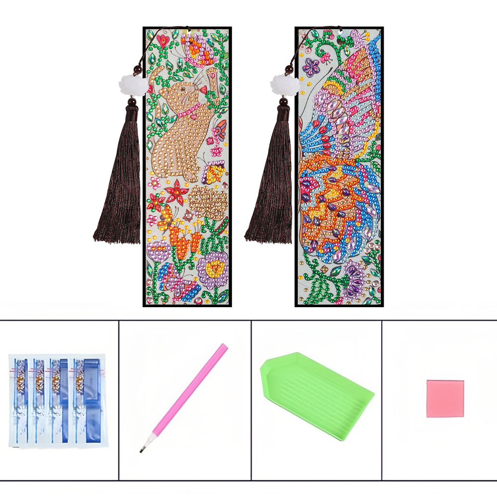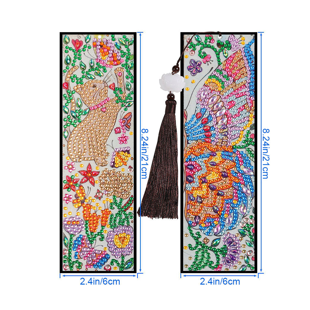 2Pcs de Marque-Pages en Cuir Chat Animé et Papillon Broderie Diamant
