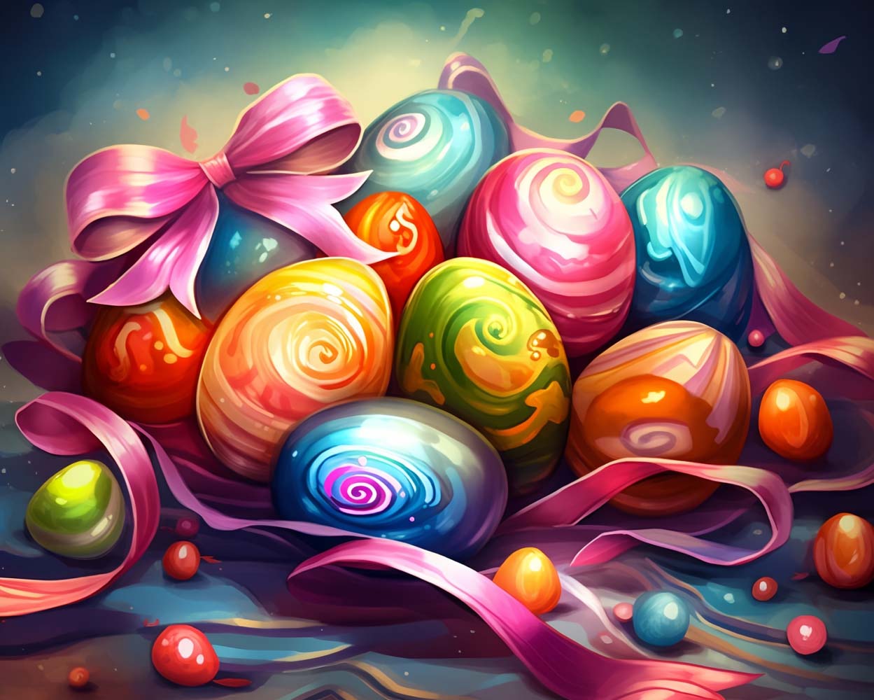 Œufs de Pâques Colorés et Ruban Rose Broderie Diamant