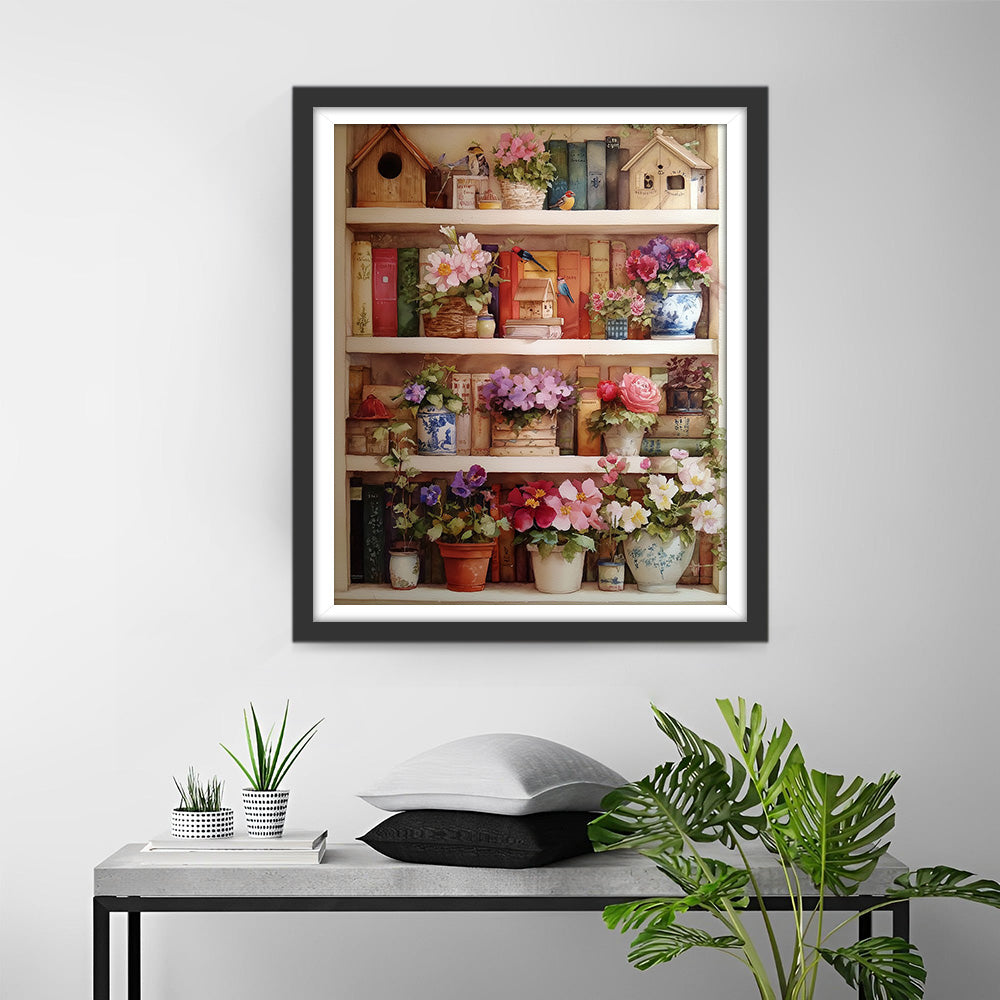 Fleurs en Pot sur l'Étagère à Livres Broderie Diamant