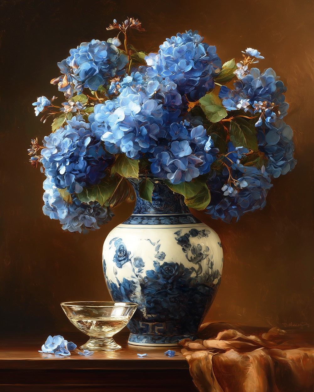 Hortensias dans un Vase en Porcelaine Bleu et Blanc Broderie Diamant