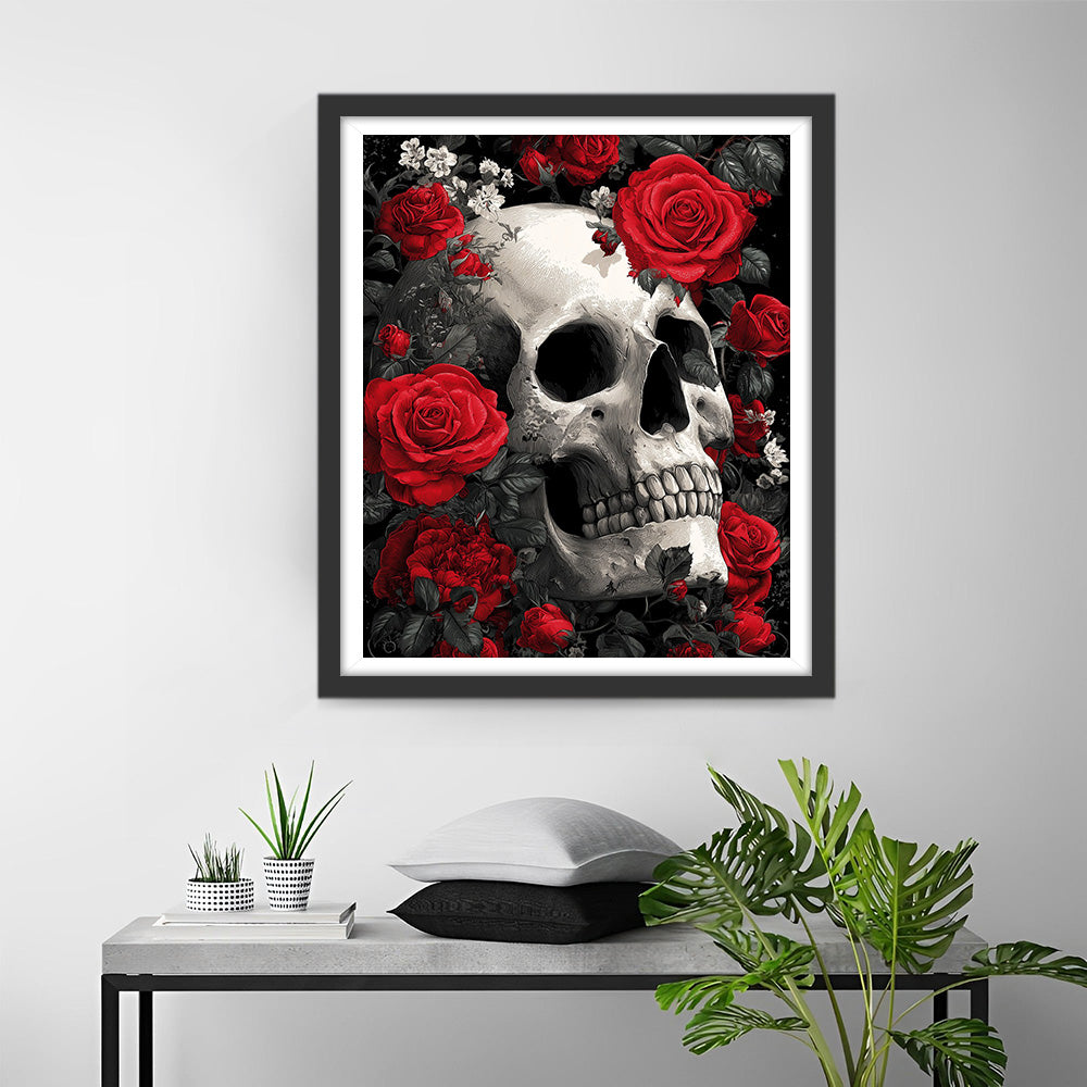 Un Crâne Blanc Pâle et des Roses Rouge Sang Broderie Diamant