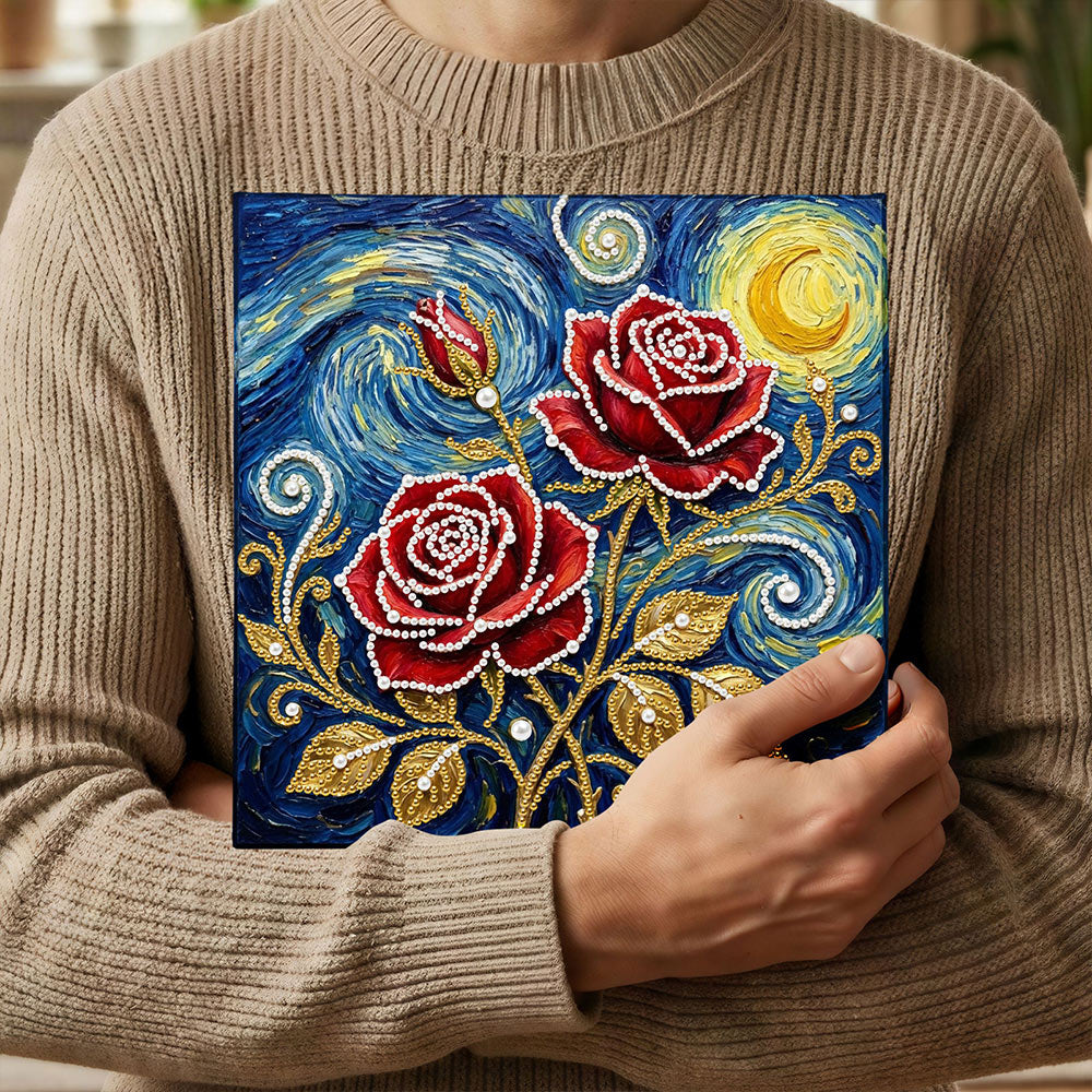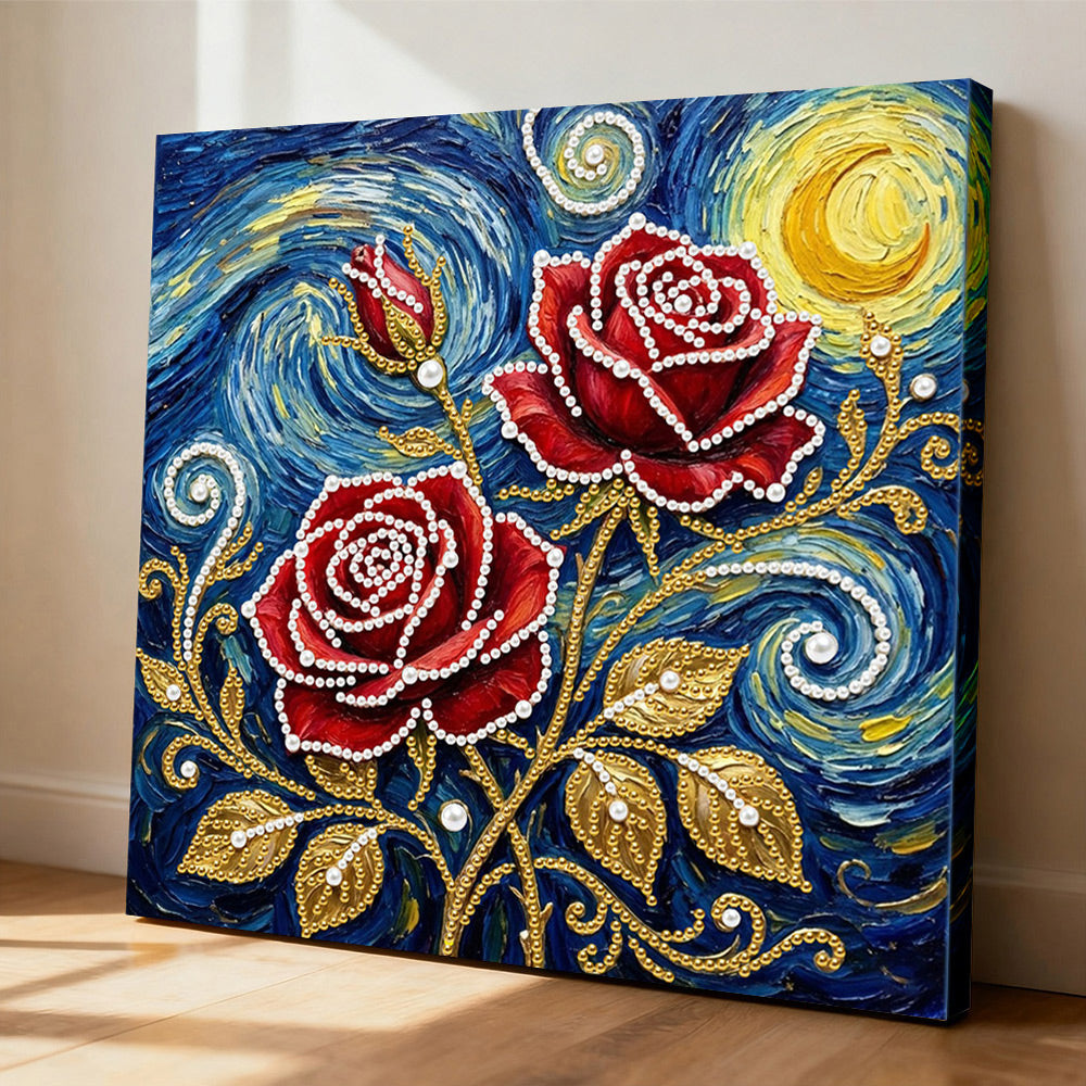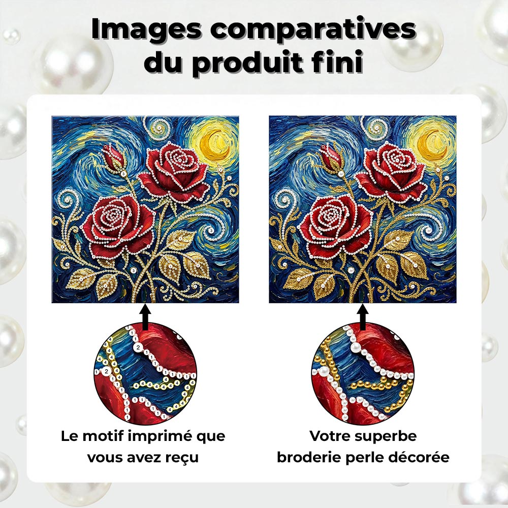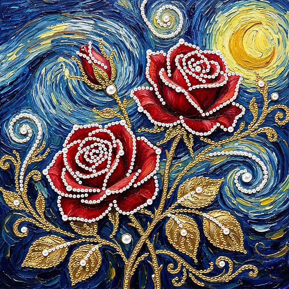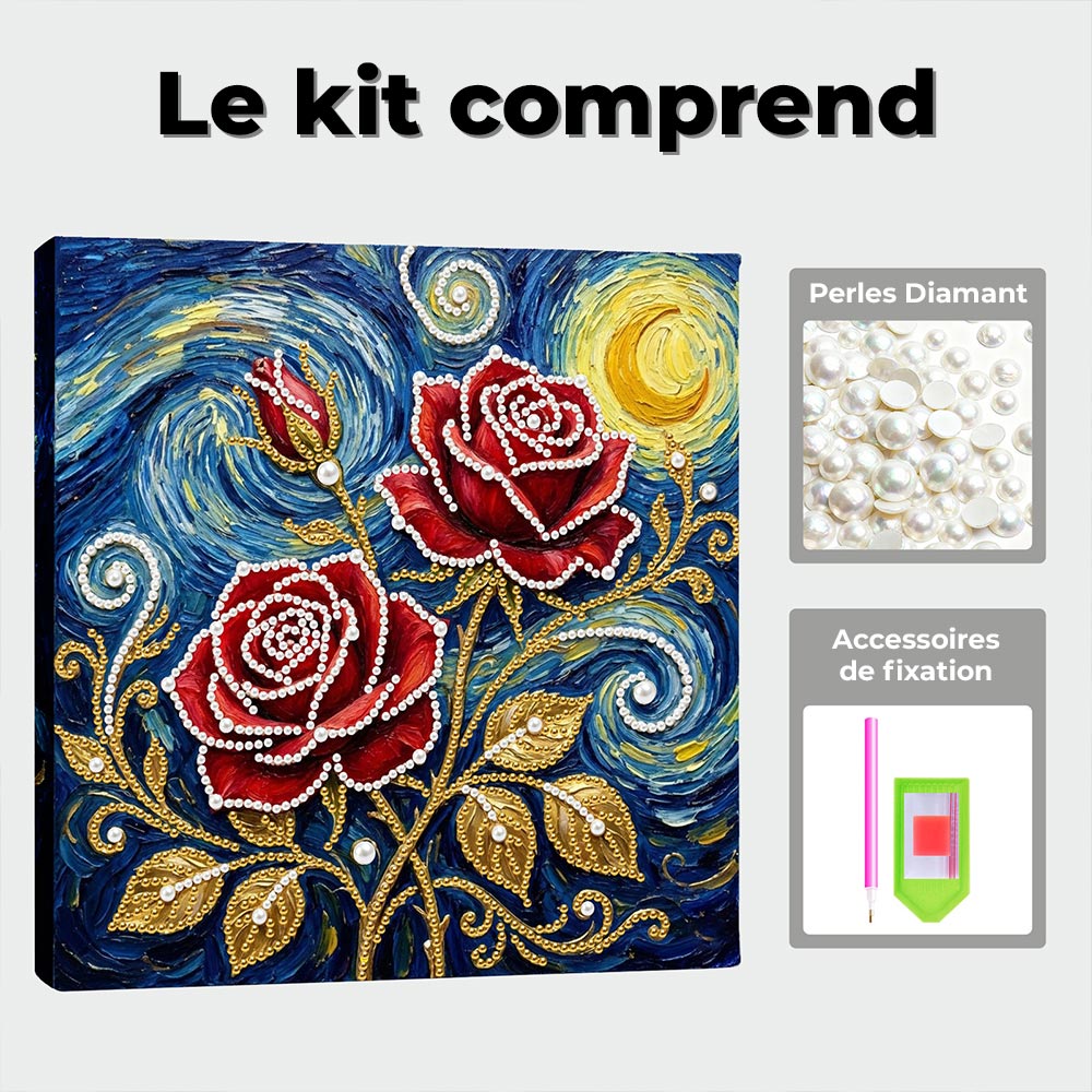Broderie Diamant | Broderie Perle | Roses Rouges sous les Étoiles et la Lune