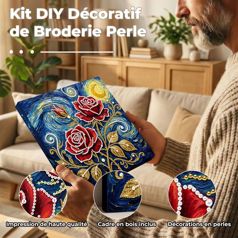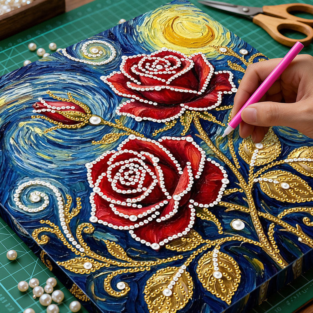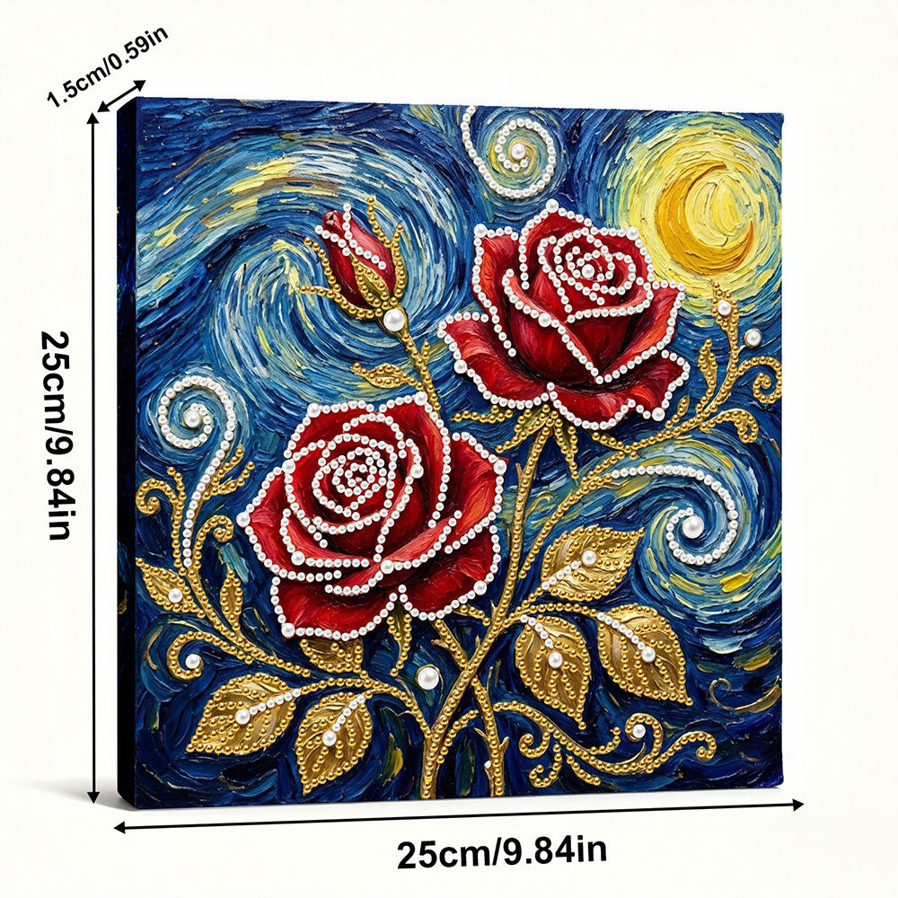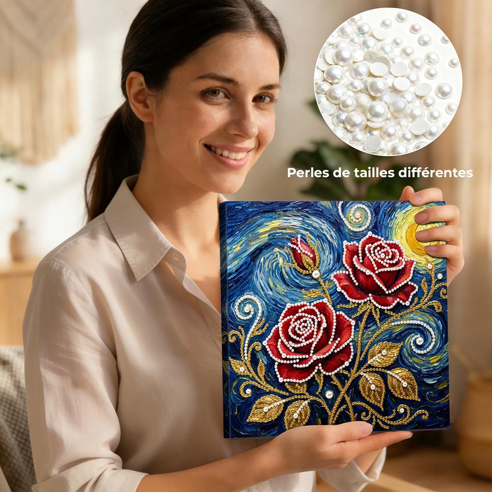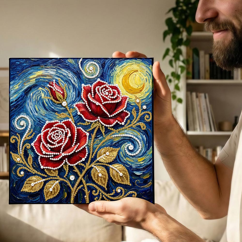 Broderie Diamant | Broderie Perle | Roses Rouges sous les Étoiles et la Lune