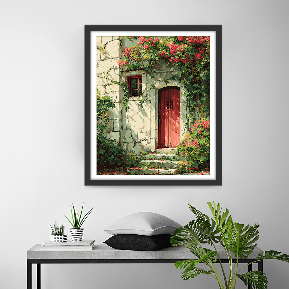 Plantes Vertes et Fleurs Rouges sur le Mur Broderie Diamant
